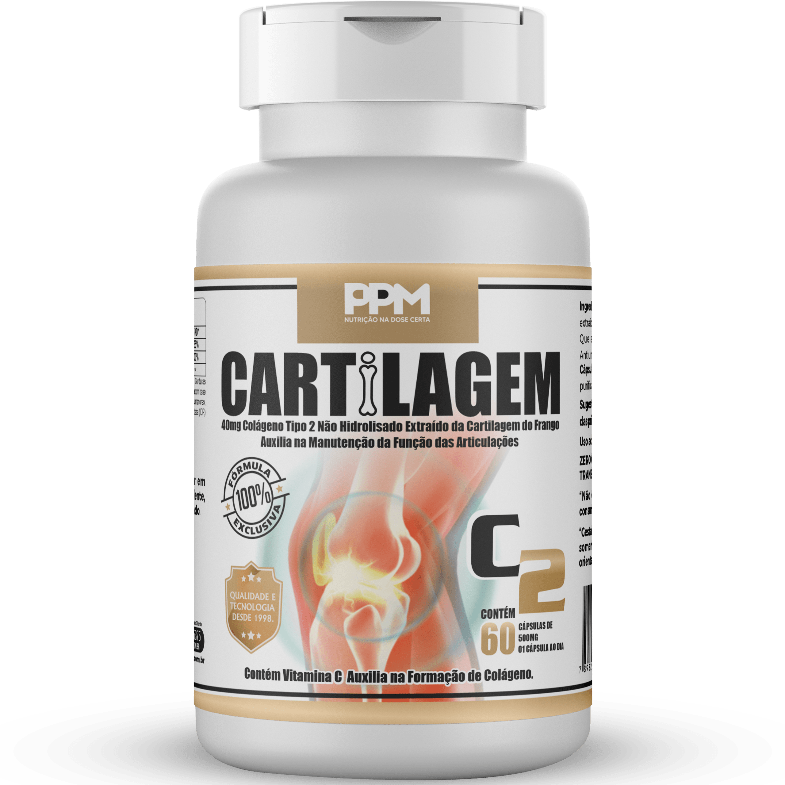 Colágeno não hidrolisado tipo II extraído da cartilagem do frango, Magnésio Quelato, Vitamina C (Ácido Ascórbico), Antiumectante: Dióxido de Silício. Cápsula: Gelatina, glicerina (umectante) e água purificada, corantes.